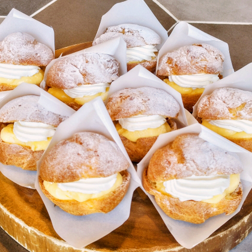 生クリームとカスタードクリームの2種類のクリームをたっぷり絞って、かわいいシュークリームの完成です!
