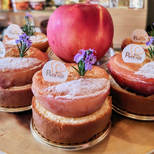 ふんわり焼き上げはちみつ生地の根塚ロールの上に紅玉の焼き